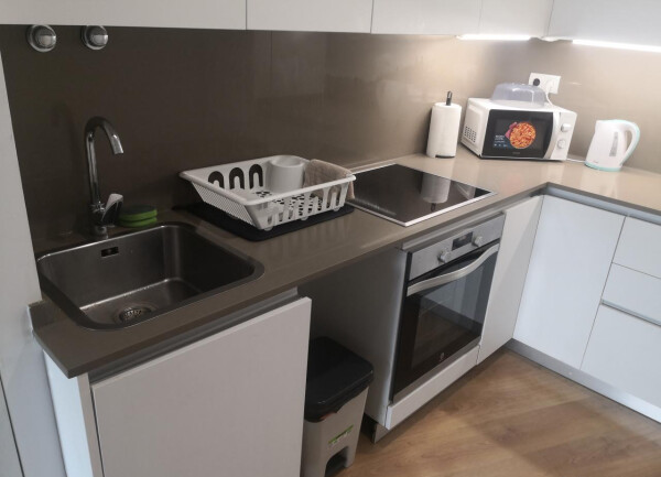 Tiene una cocina equipada con nevera, placa de inducción, horno multifunción, microondas, cafeteras de cápsulas y hervidor de agua. También tiene vajilla, vasos, tazas, cubiertos y cazuelas y sartenes para poder cocinar.