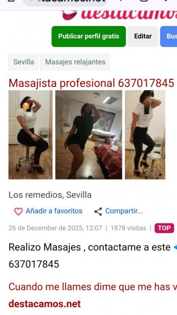 Hola!! Soy una chica que ofrece masajes profesionales . Si buscas una experiencia inolvidable, un trato personalizado con much has encontrado a la chica adecuada!!. Podrás relajarte mientras disfrutas de una experiencia muy y . Te encontraras en un ambiente maravilloso, con un trato especial y una atención única. Si estás realmente interesado no dudes en contactar conmigo, ATENCIÓN personal, los detalles acordamos en persona.estoy de lunes a sábado, desde las 10 hasta las 21