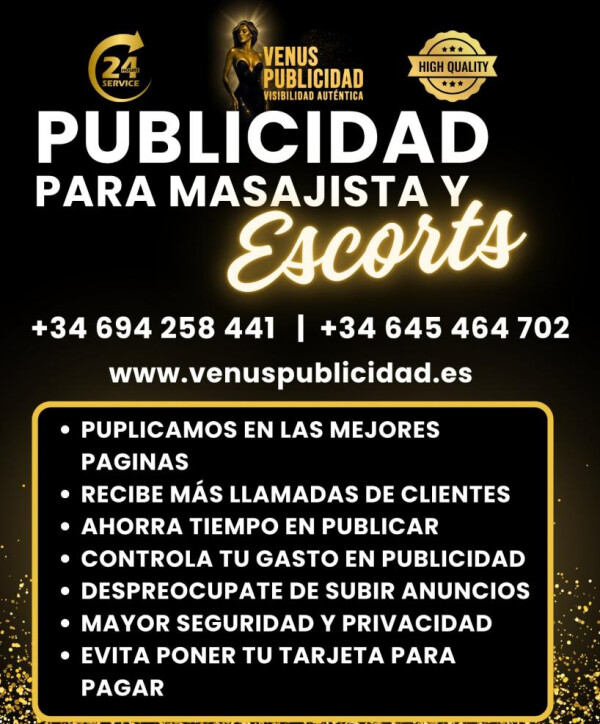 Publicista con una gran experiencia, trabajo en cualquier ciudad de España y puedo ayudarte a aumentar tu éxito recibiendo más llamadas y que así ganes más , seas: - CHICAS ESCORTS - CHICOS ESCORTS - TRANS ESCORTS - MASAJISTAS - CASAS DE CITAS - PISOS ALQUILER DE HABITACIONES Te posicionare en las principales páginas del mercado creándote una pub...